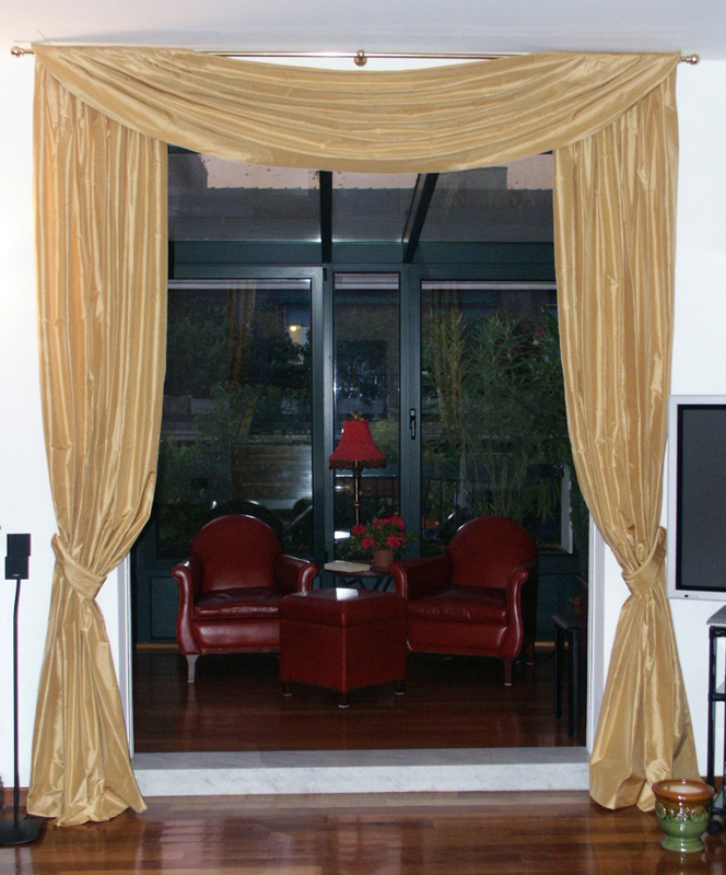 Curtains packaged traditional pleated with decorative drape, applicator fixed on stick in polished brass.