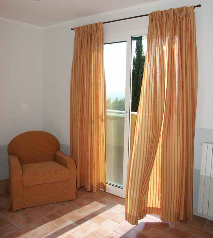 Traditional Curtain with fixed pleats applied to wrought iron stick.