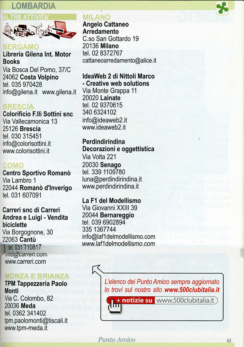Sponsorizzazione per la realizzazione della Guida Speciale “Punto Amico” del Fiat 500 Club Italia, una raccolta dettagliata delle diverse imprese selezionate per categoria d’appartenenza nelle diverse regioni e province d’Italia, dedicata a tutti i soci iscritti.