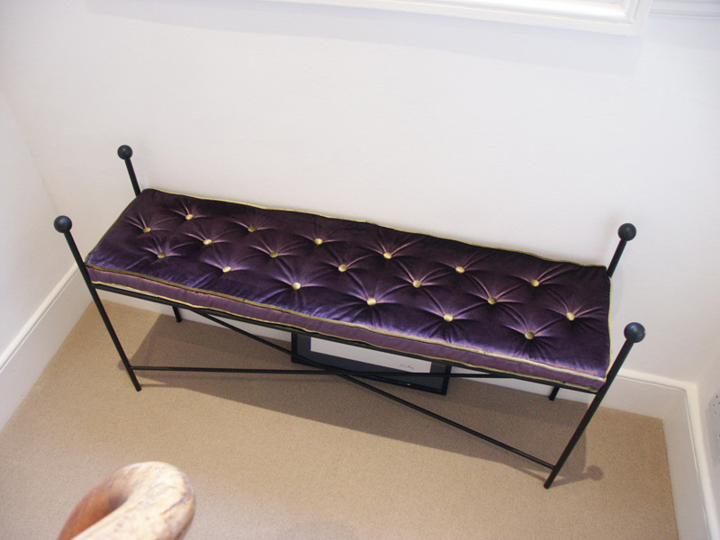 Panca in ferro battuto colore nero con cuscino imbottito in lana realizzato a misura con impunture a bottoni di colore diverso sistema a capitonnè.