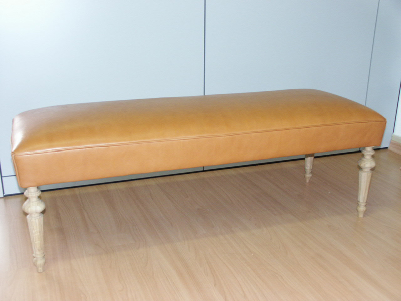 Panca per ingresso imbottita sistema tradizionale e rivestita in cuoio naturale con gambe in rovere naturale.