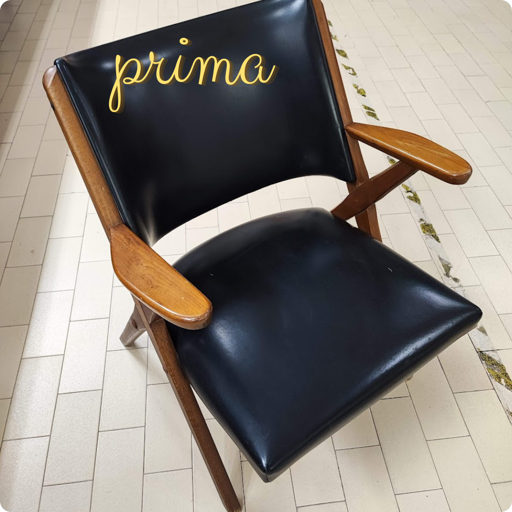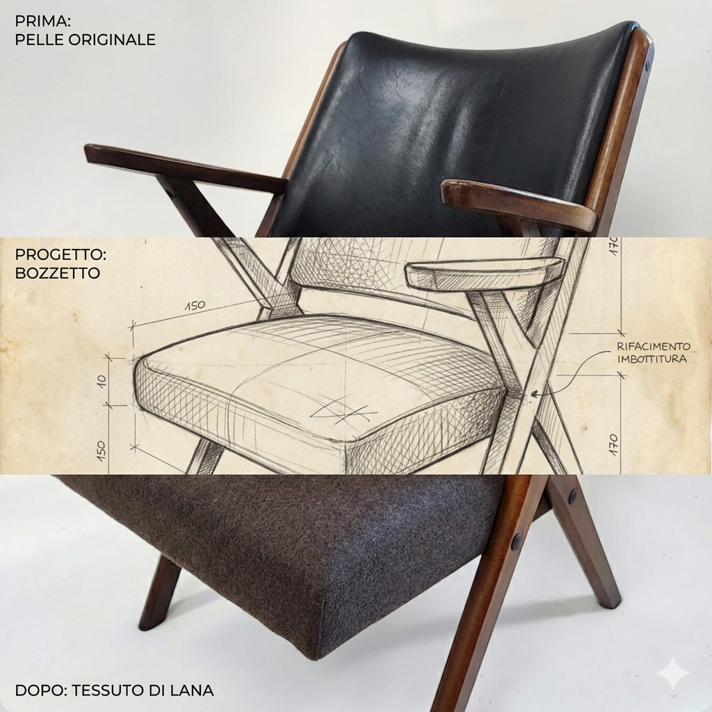 Osservando le immagini, il salto è evidente. La sedia, un classico del design moderno, presentava un rivestimento usurato, probabilmente vittima del tempo e dell’utilizzo. La pelle nera, sebbene elegante, mostrava i segni dell’età, spegnendo la vivacità del pezzo. L’intervento di TPM Tappezzeria è stato mirato e preciso: la struttura in legno, vero cuore pulsante della sedia, è stata restaurata con cura, preservandone la forma e la bellezza originale.