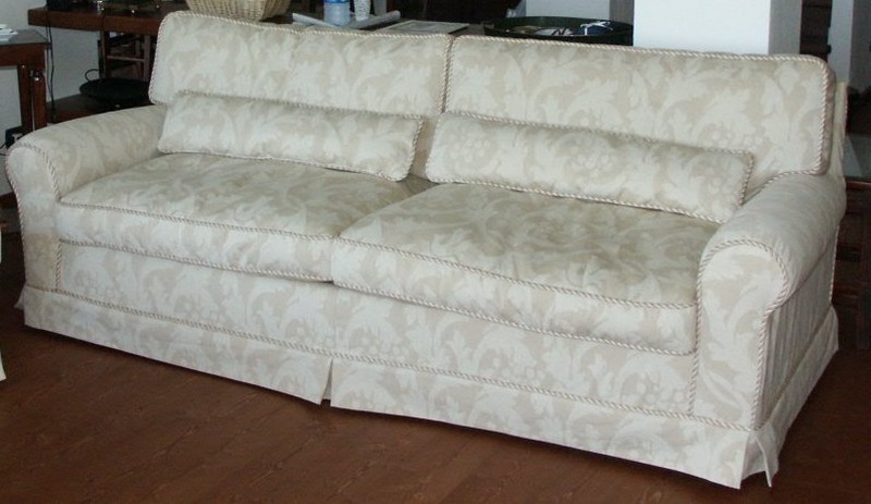 Divano 2 posti grande imbottito in bianco, versione sfoderabile con cuscini seduta e schienale in piuma e con cuscini poggiareni.
