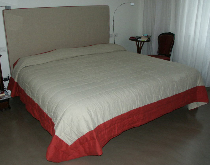 Letto matrimoniale imbottito in bianco con reti ortopediche a doghe legno, materasso ortopedico e guanciali in piuma; versione sfoderabile con copriletto confezionato foderato e bordato a lenzuolo.