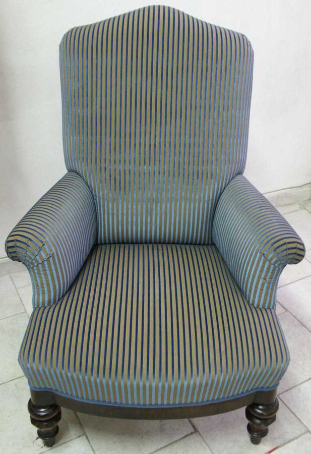Poltrona in stile imbottita sistema tradizionale. Rivestimento fisso con tessuto classico rifinito con passamaneria gambe e struttura in noce nazionale lucido.