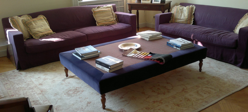 Grande Pouff centro salotto imbottito sistema tradizionale e rivestito sistema fisso con gambe in noce nazionale.
