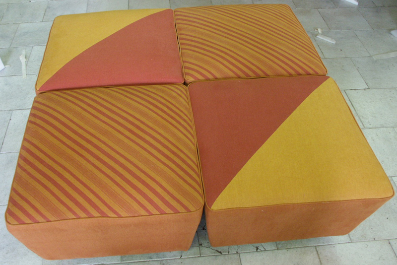 Pouff modulari imbottiti e rivestiti in tessuto sistema fisso con piedini bassi.