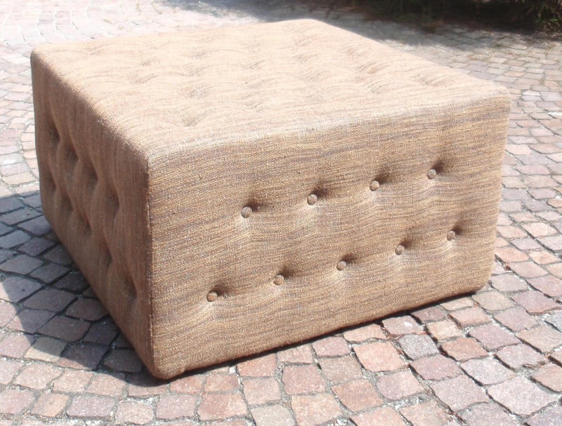 Pouff imbottito e rivestito sistema fisso con bottoni decorativi e piedini bassi.