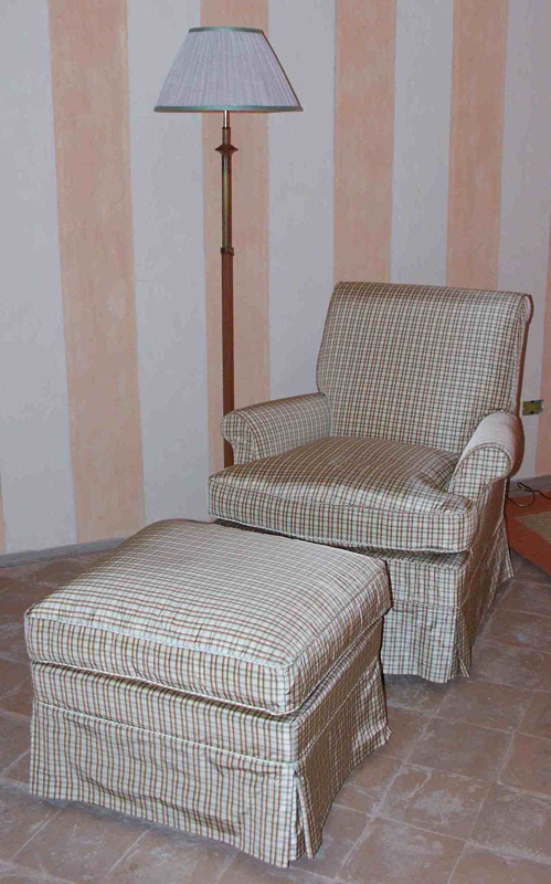 Pouff quadrato fronte poltrona imbottito con cuscino in piuma sfoderabile.